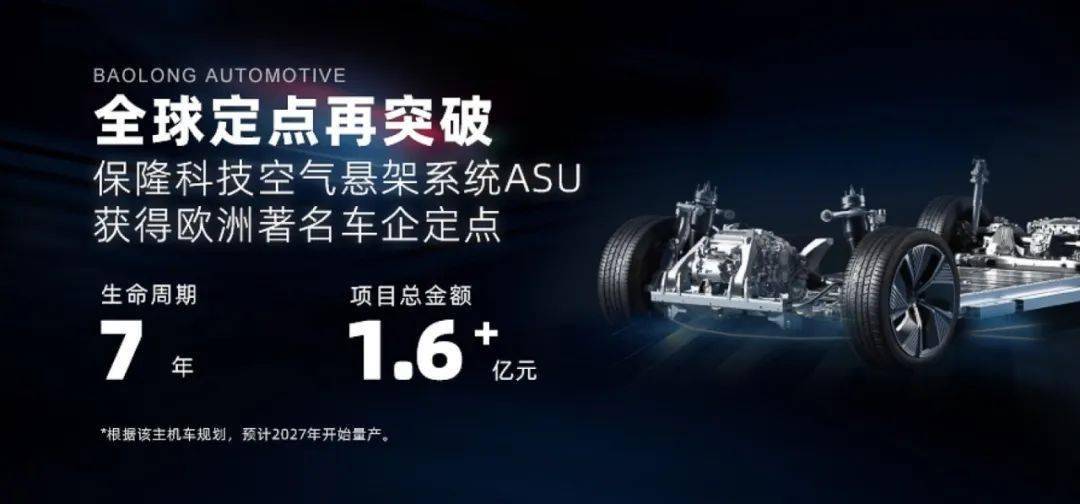 近期,保隆科技收到欧洲某著名车企的《定点通知书》,成为其全新平台项目空气悬架系统供气单元(ASU)的零部件供应商。根据该主机厂规划,项目生命周期为7年,生命周期总金额超过人民币1.6亿元,预计2027年开始量产。