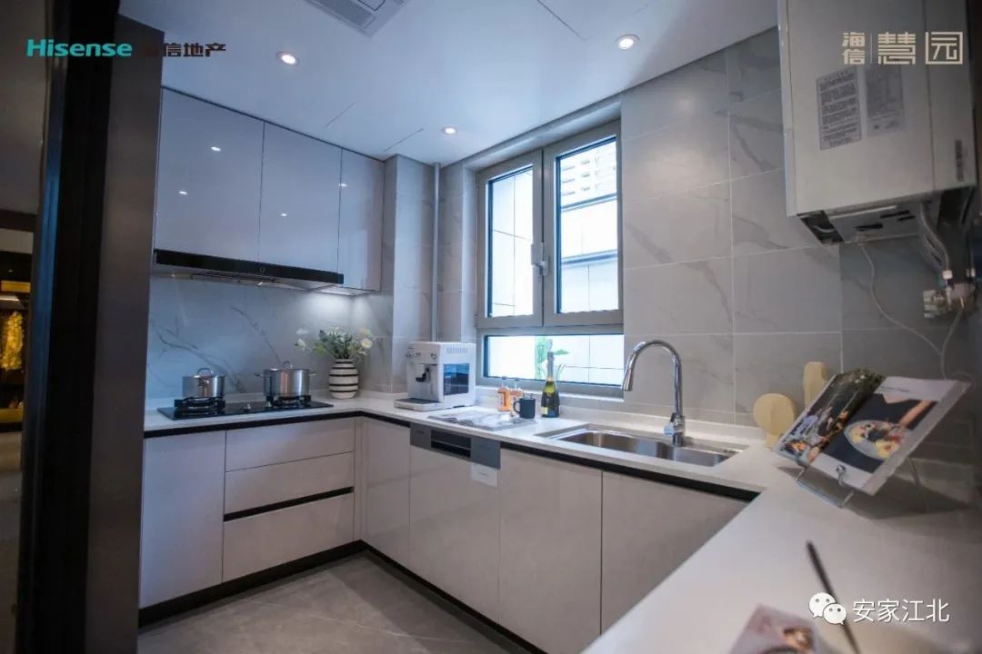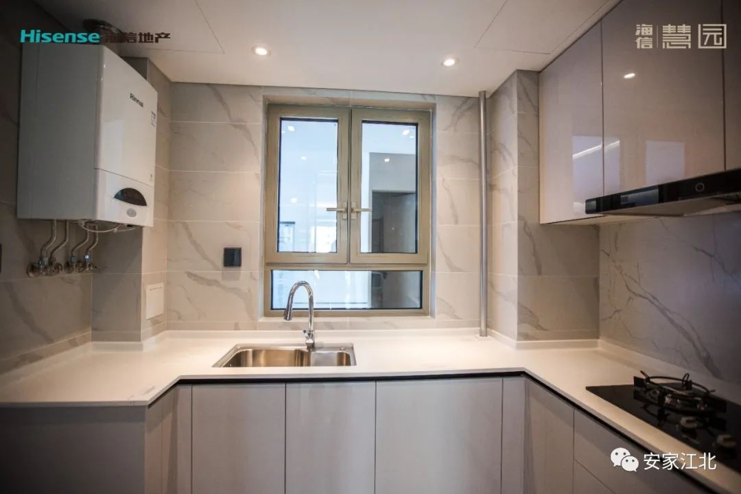 值得关注的是,厨房柜体后面的墙体也是铺了瓷砖的,要知道很多项目为了节省本金柜体后面直接就是白墙,从细节处可见海信慧园的产品力。