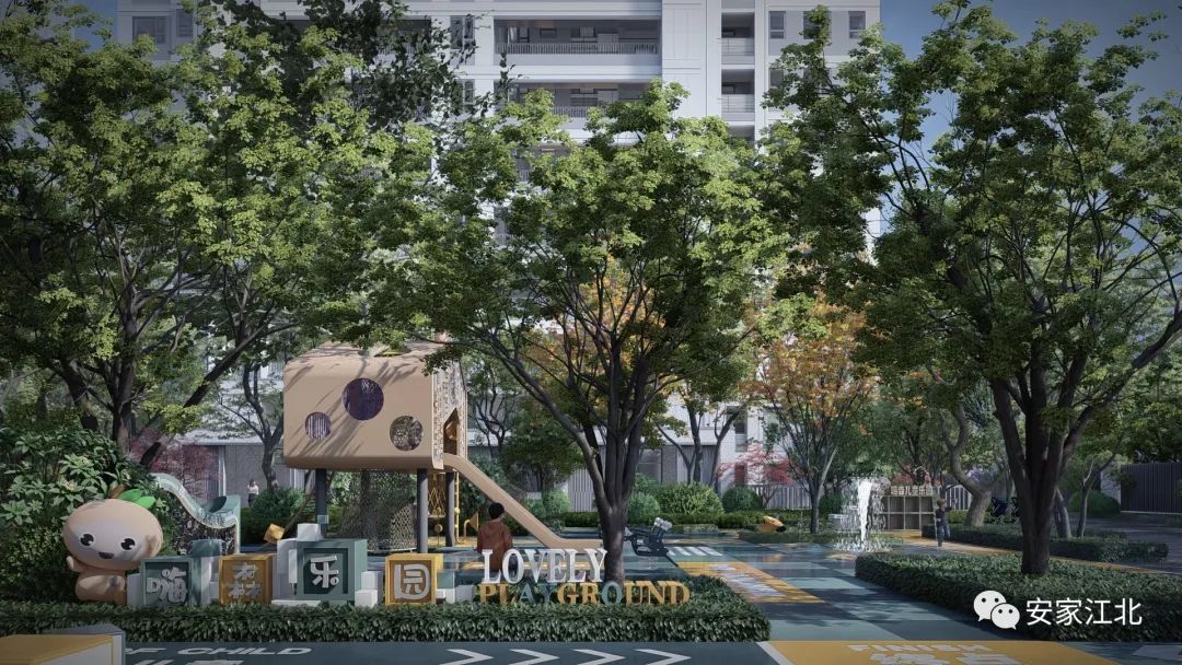 在中心景观西侧便是约500㎡的阳光草坪,其相当于1个标准网球场的面积。而在草坪的西侧,是以海信地产吉祥物小嗨为主形象的嗨森主题儿童乐园。